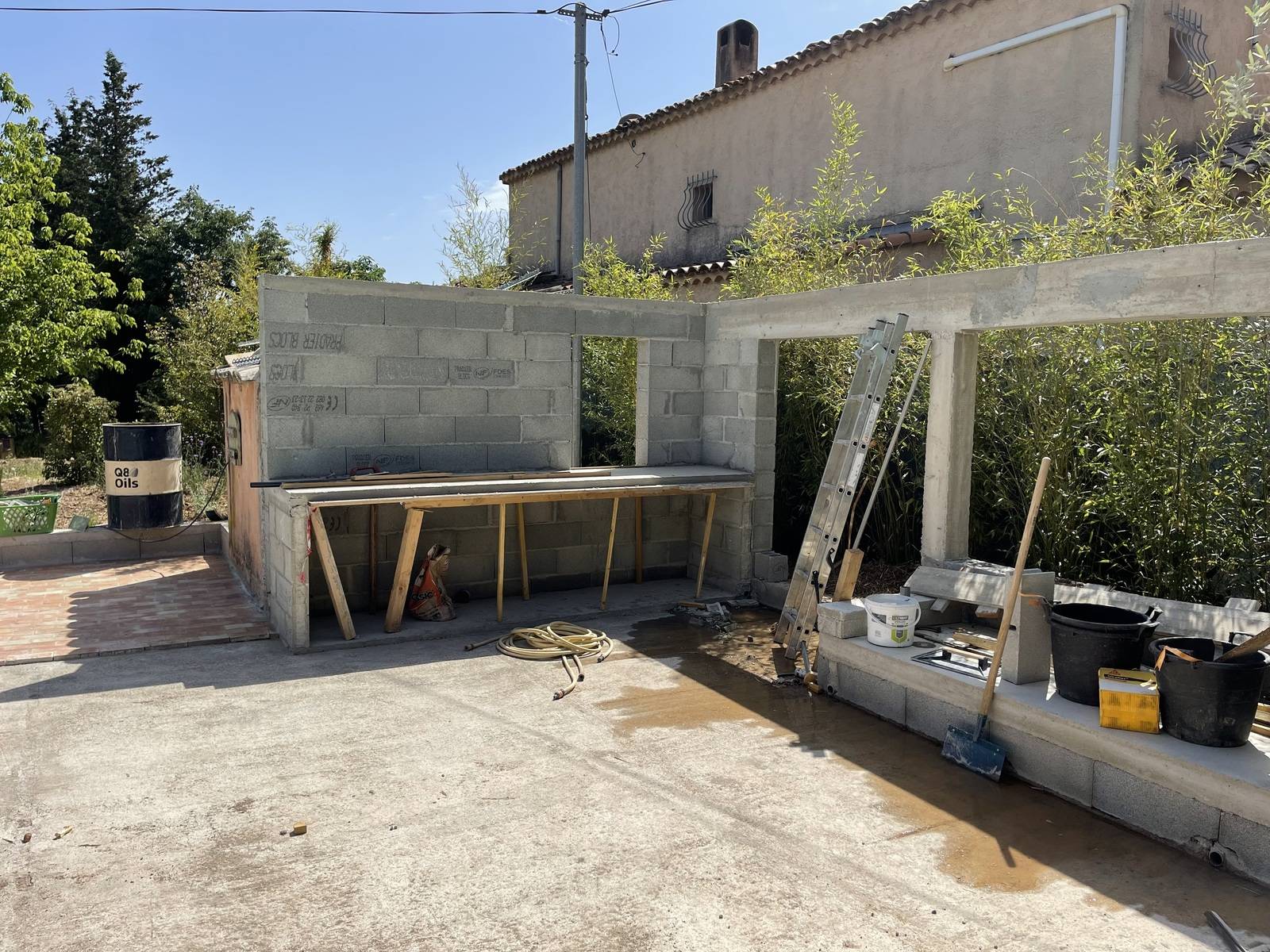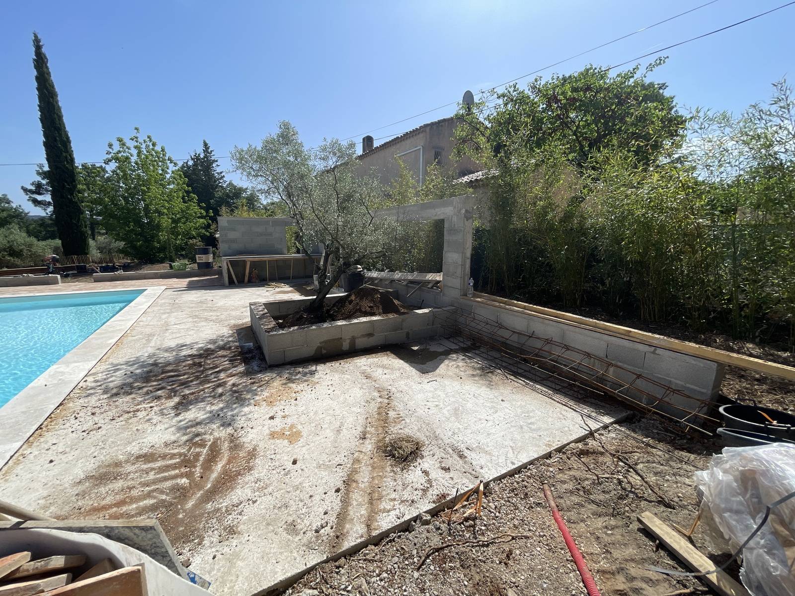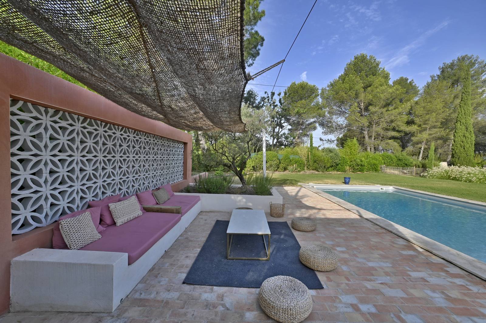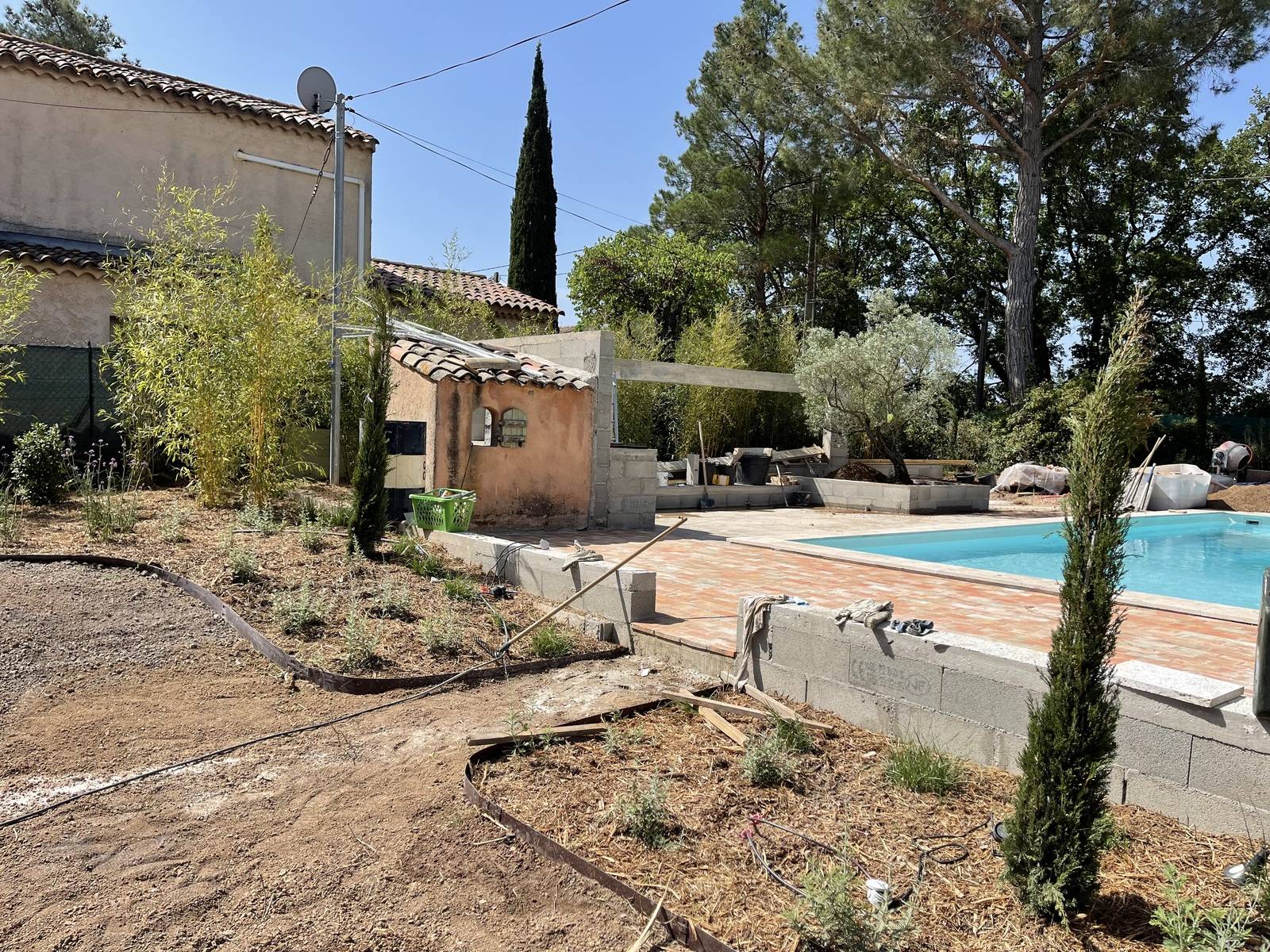 Nous y avons créé plusieurs espaces de vie tels que, la terrasse ombragée, l'espace détente, la cuisine d’été et le terrain de pétanque.