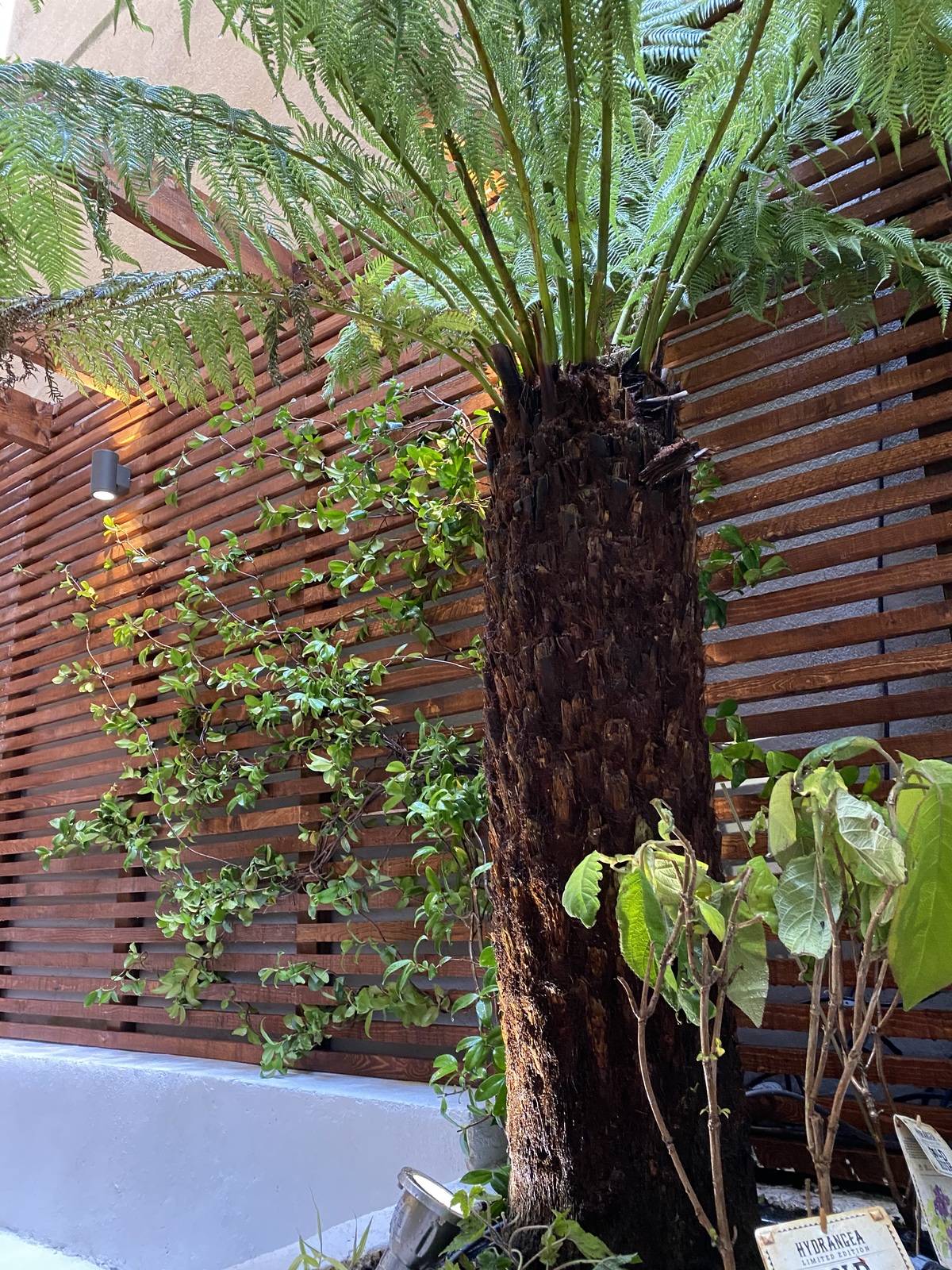 Pour les plantations nous avons fait le choix de végétaux à feuillages persistants (pour un minimum d'entretien) et adaptés à l’emplacement de cette cour (Dicksonia Antartica, Trachelospermum jasminoides, Hakonechloa macra Beni-Kaze, Hydrangea aspera Goldrush et Tiarella Crow Feather) avec l'installation de système d'arrosage automatique avec programmateur.