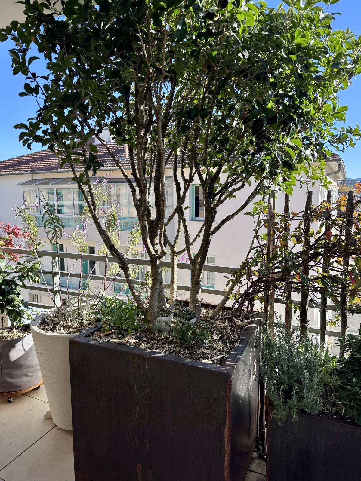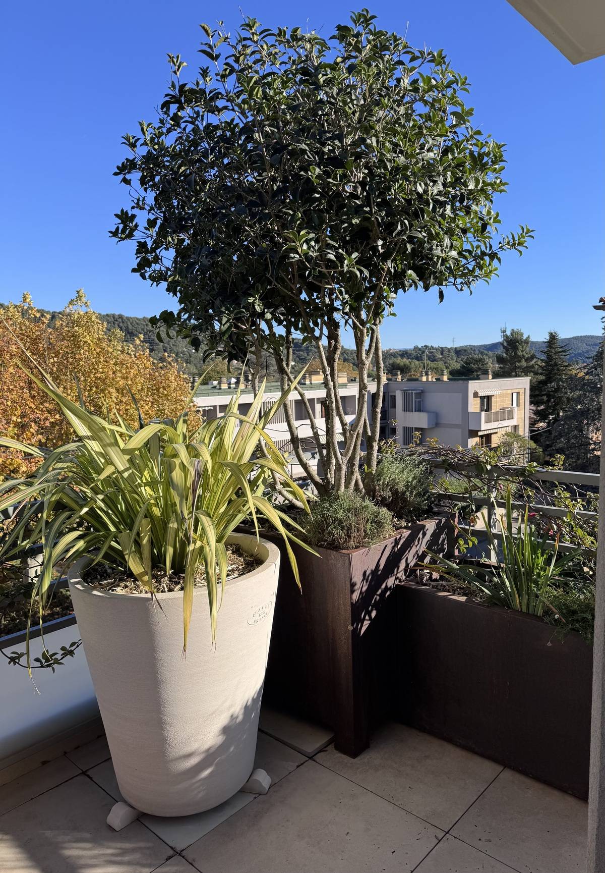 Avec des jardinières bien choisies et des plantes adaptées, nous avons transformé cette terrasse en un véritable coin de paradis.