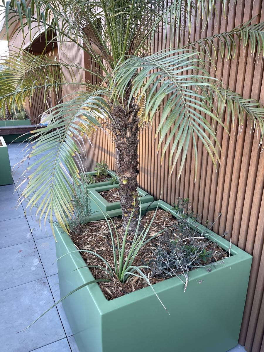 Après avoir procédé à l'installation de jardinières, nous les avons repeintes en vertes (sur la demande de notre client) puis nous avons installé une cabane de jardin. Nous nous sommes occupés des diverses plantations (Salvia, Pittosporum, Hesperaloe, Lavande papillon, Astelia...) puis nous avons crée un coin douche en bois exotique ainsi que 2 bancs sur mesure.