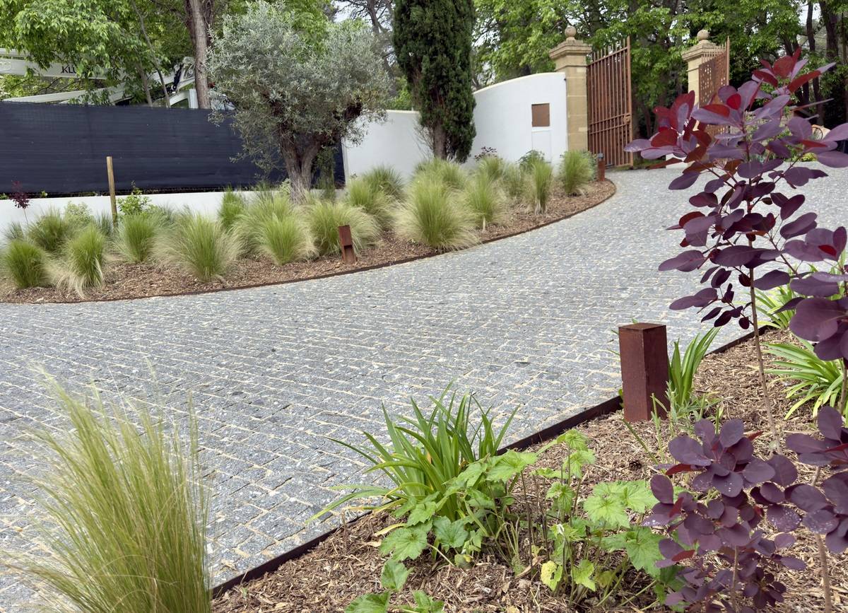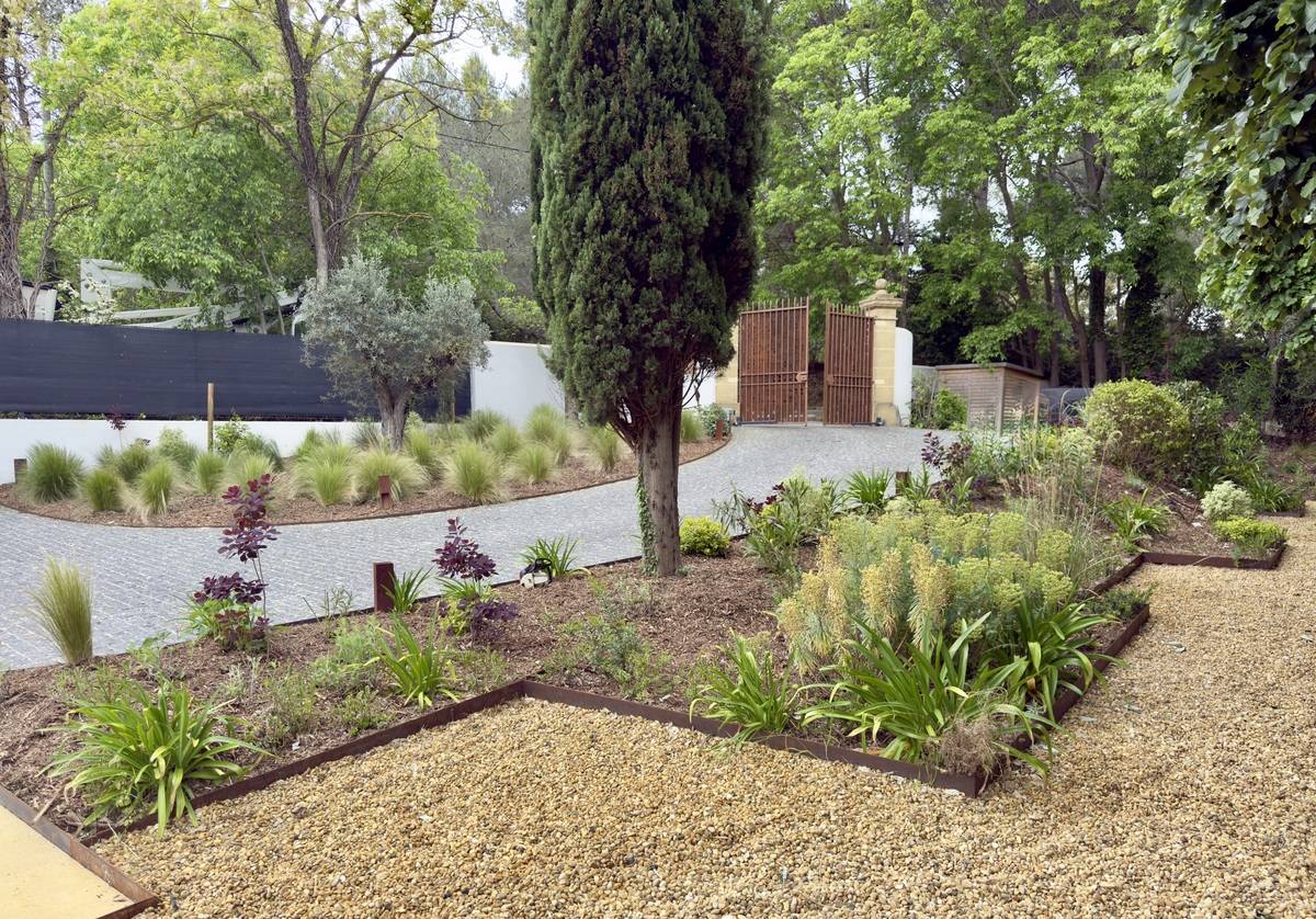 Des bordures en acier corten ont été installées pour structurer les massifs, complétés par des plantations méditerranéennes soigneusement sélectionnées : Cupressus, Agapanthus, Pittosporum, Pennisetum, Yucca Rostrata, Quercus Ilex, et un vieil olivier en point focal.