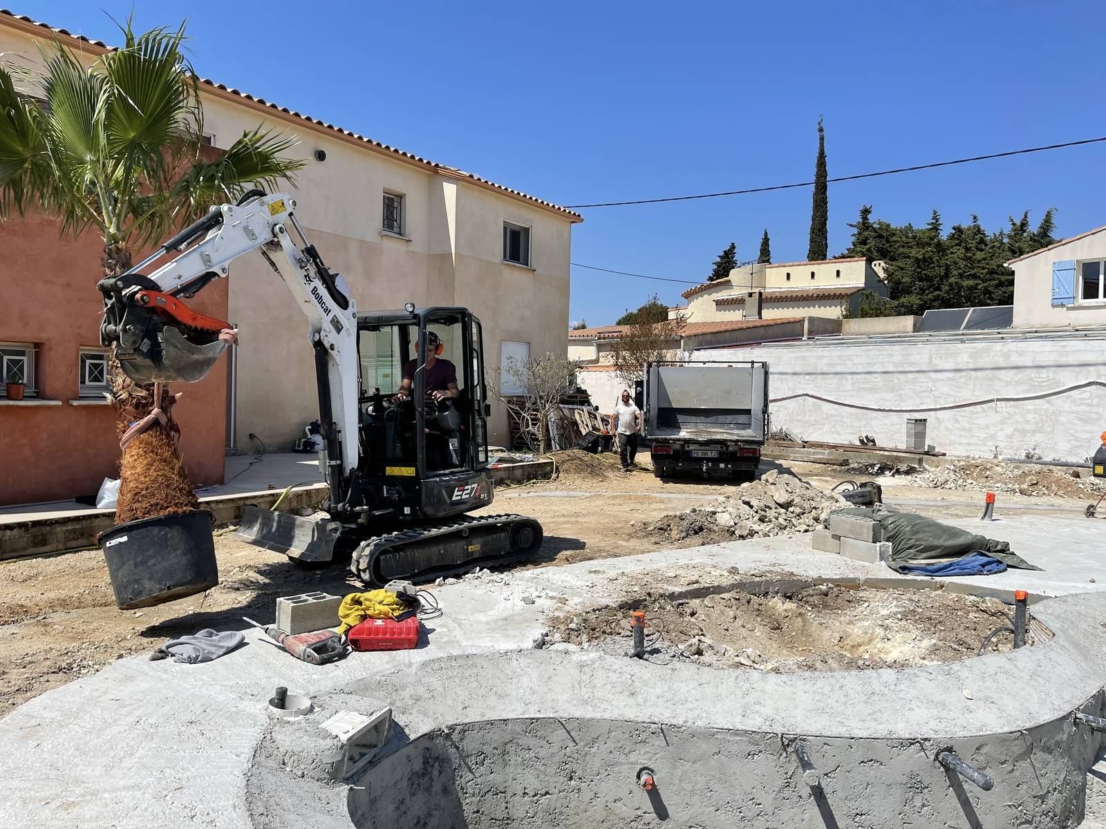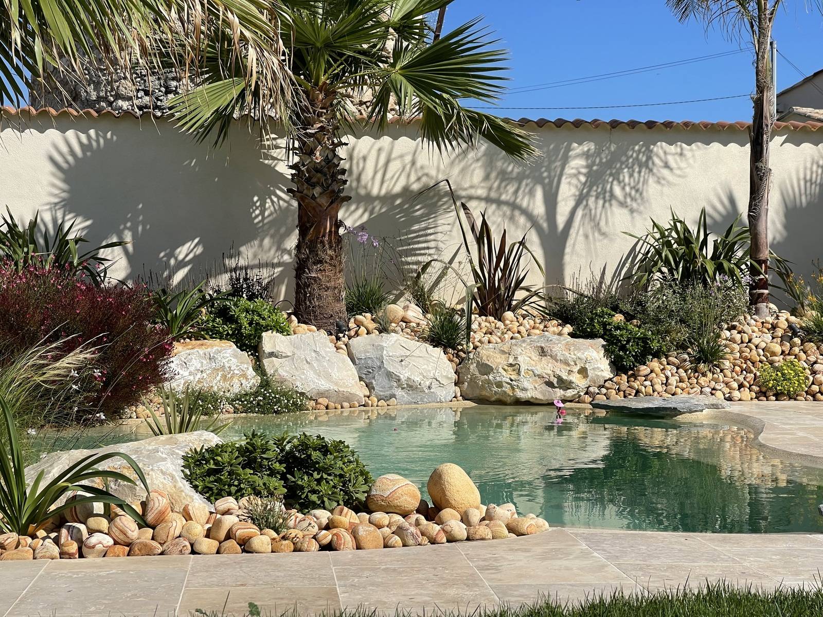 Nous avons créé autour du bassin des massifs de plantes méditerranéennes, planté diverse variétés de palmiers et réalisé un nouvel espace en gazon naturel en plaque.